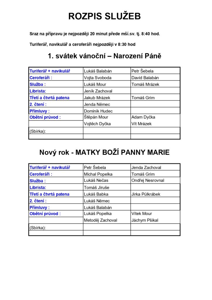 Prosím, věnujte pozornost vánočnímu rozpisu ministrantských služeb. Na sv. Štěpána 26. 12. v 9:00 bude mše v latině, tradičně se k nám připojí stará ministrantská garda. Děkujeme a přejeme vám požehnané sváteční dny.